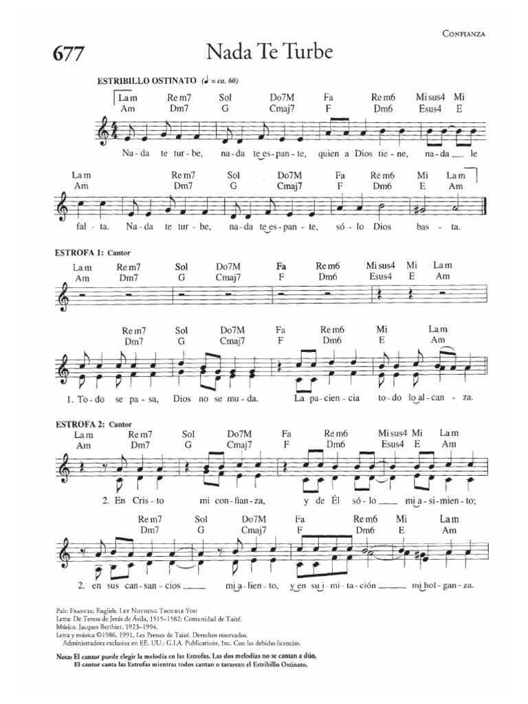 Nada te turbe nothing can trouble st. En cristo mi confianza, y de él solo. Taize the taize community is an ecumenical monastic order that invites people of different christian faiths to worship together. Jacques berthier published in 27 hymnals. Nada te turbe is a popular hymn sung in taize services.